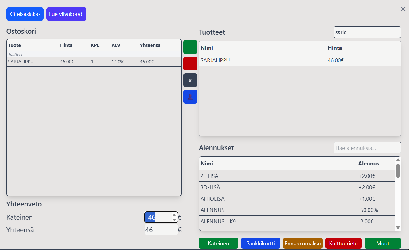 * Jos asiakas maksaa useammalla maksutavalla (esim. osa kulttuuriedulla, osa kortilla):&#x20;