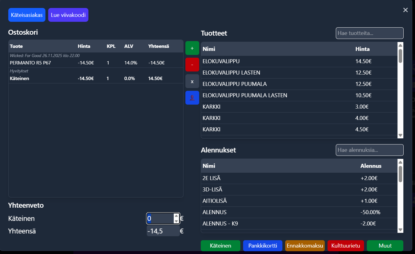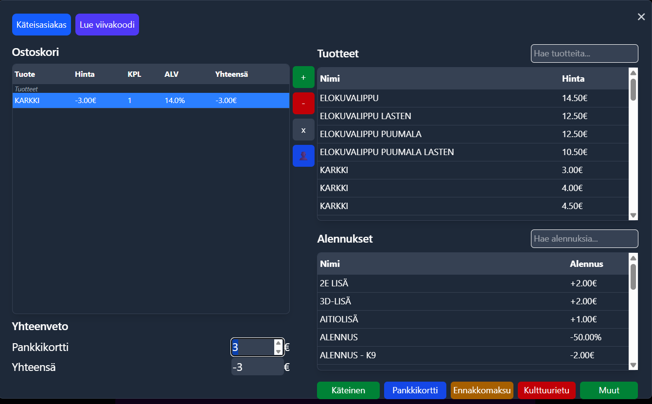 * Paina Enter uudestaan niin myynti peruuntuu ja voit palauttaa rahat asiakkaalle maksutavan mukaan.&#x20;