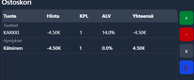 * Ostoskorissa valitse tuote jonka myynnin haluat perua & palauttaa rahat asiakkaalle&#x20;