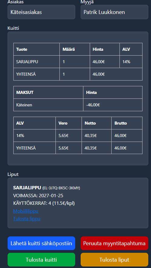 Erittäin tärkeää muistaa mitätöidä lahja- ja sarjalippujen sekä lahjakorttien myynnit maksutapahtumien kautta, jotta digitaalinen lippu ei ole enään asiakkaan käytössä ja se poistuu raporteilta.&#x20;