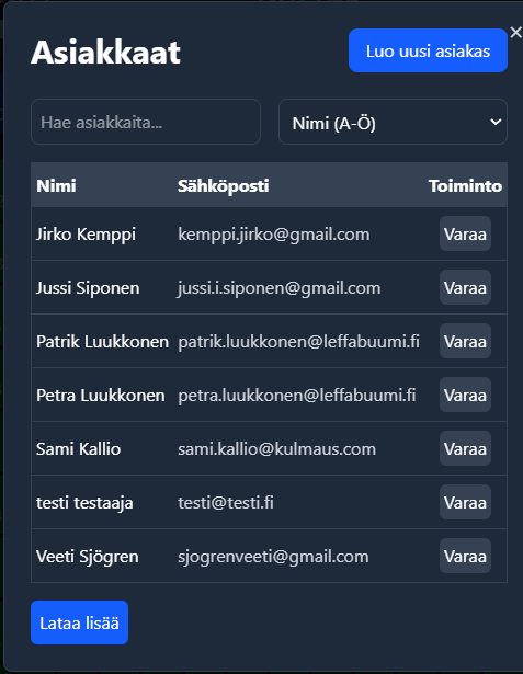 * Mikäli asiakasta ei löydy listalta klikkaa “Luo uusi asiakas”&#x20;