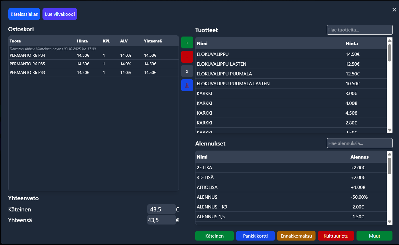 * Jos varaukseen kuuluu useampi lippu, maksun voi jakaa useamman asiakkaan kesken. Valitse tällöin varauksesta se määrä lippuja, jonka kyseinen asiakas haluaa maksaa.&#x20;