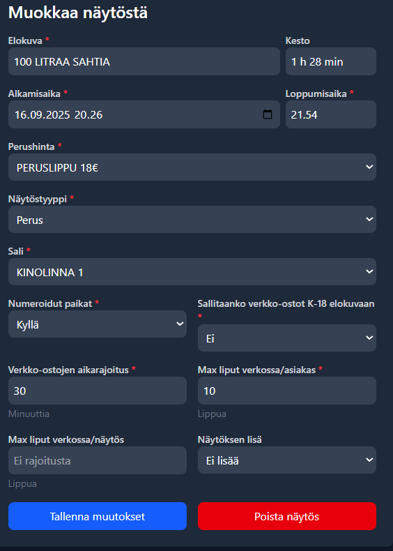 9. Max liput verkossa/asiakas: Voit määrittää kuinka monta lippua yksittäinen asiakas voi ostaa näytökseen&#x20;