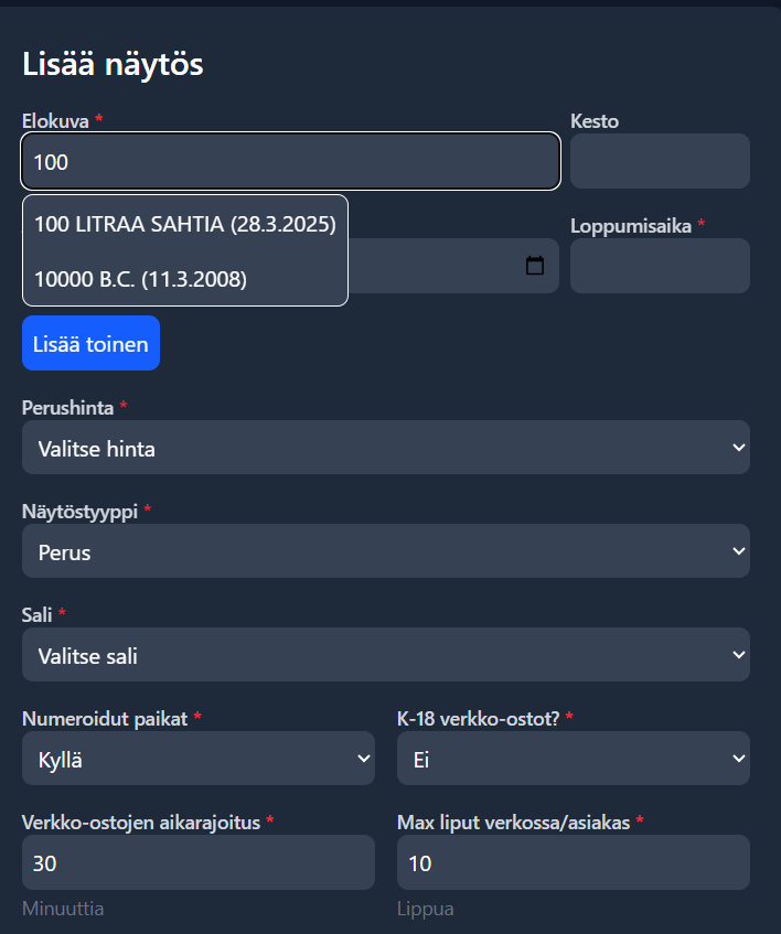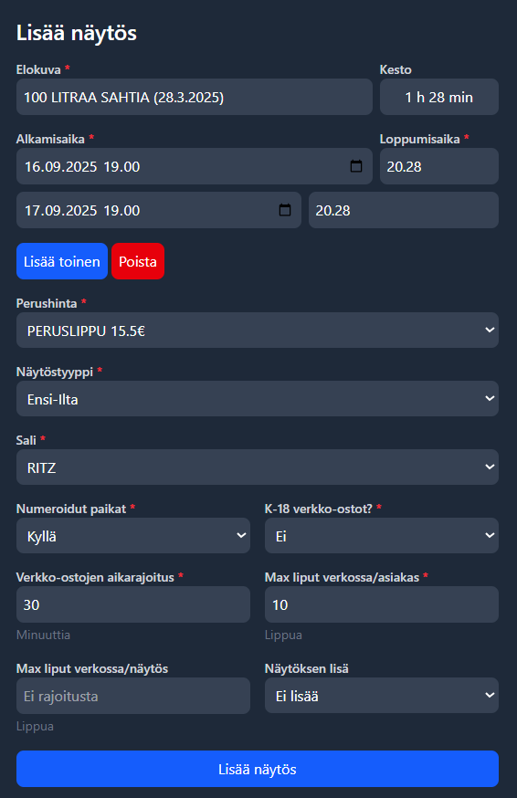 * Hyödynnä lisää toinen-toimintoa, lisätäksesi helposti uusia näytöksiä&#x20;