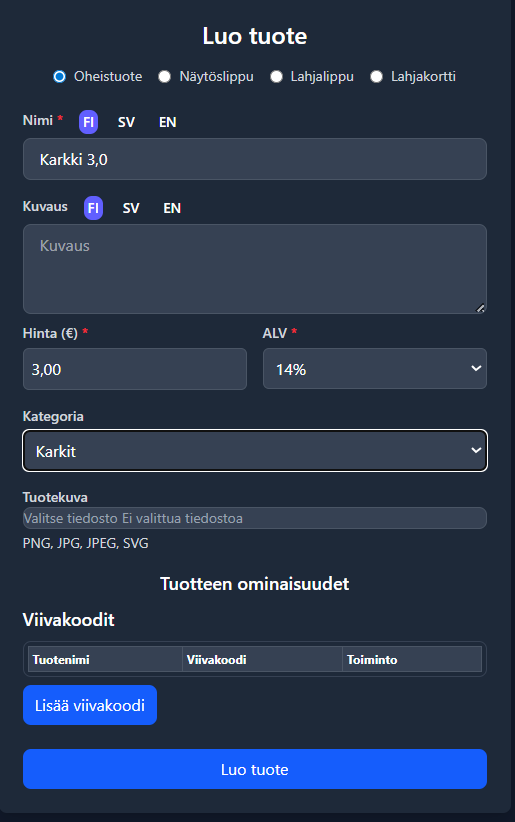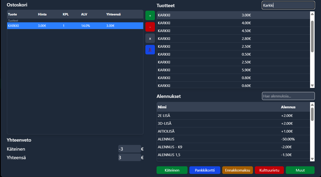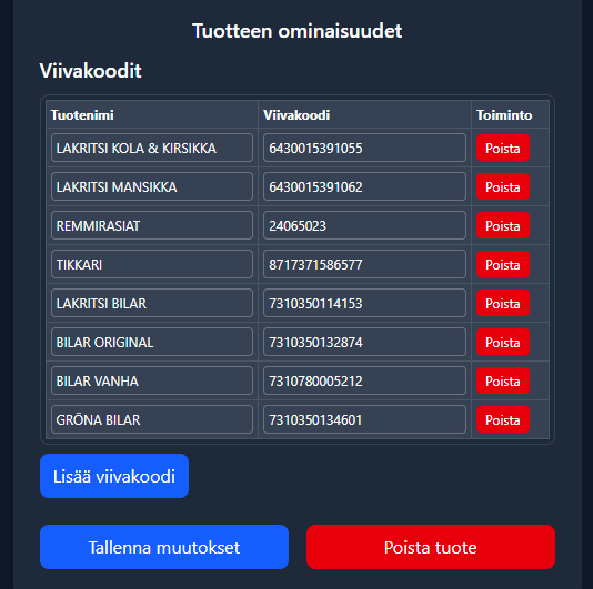 * Voit luoda yhden tuotteen ”kategoriahinnalla”, esim. Karkki 3,00 €, ja liittää sen alle useita eri karkkien viivakoodeja. Näin kaikki samaan hintaluokkaan kuuluvat tuotteet menevät saman tuotteen alle.&#x20;
